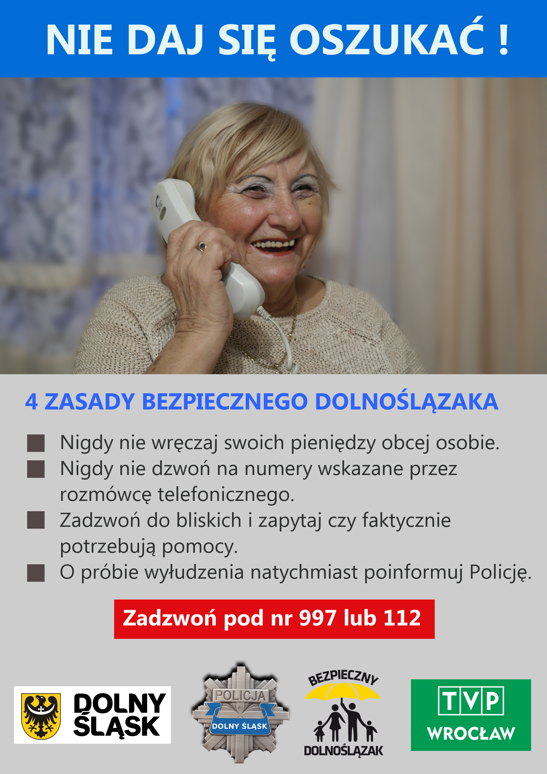 • W przypadku jakichkolwiek podejrzeń, że może to być próba wyłudzenia pieniędzy prosimy o natychmiastowe powiadomienie Policji dzwoniąc pod numer alarmowy 112. Nie dajmy przestępcom szansy! Nie pozwólmy, aby zabrali oszczędności naszego życia!