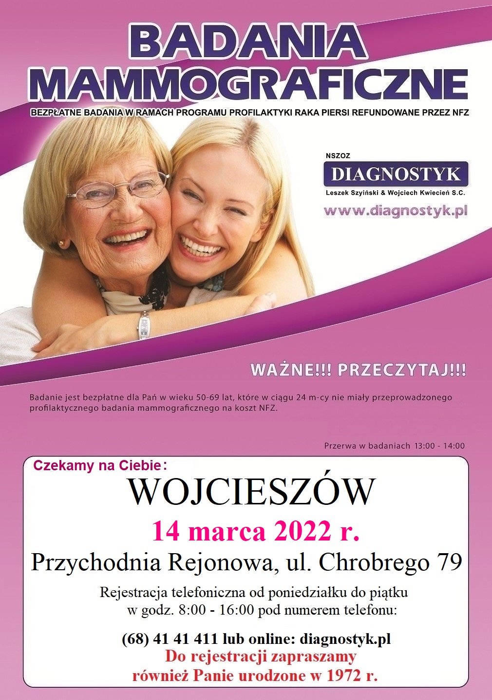 wieku 50-69 lat do BEZPŁATNYCH BADAŃ MAMMOGRAFICZNYCH.