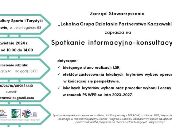 Szanowni Państwo, Zarząd Stowarzyszenia ,,Lokalna Grupa Działania Partnerstwo Kaczawskie" zaprasza na spotkanie informacyjno-konsultacyjne , które odbędzie się w środę 17 kwietnia b.r. w godzinach od 10 do 14.00 w Centrum Kultury Sportu i Turystyki w Świerzawie. Spotkanie będzie głównie dotyczyło prac nad procedurami wyboru i oceny operacji, które będą realizowane… czytaj więcej