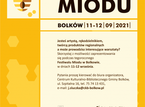 Centrum Kulturalno-Biblioteczne Gminy Bolków organizuje w dniach 11-12 września festiwal miodu w związku z czym zapraszamy osoby, które by chciały właśnie wsiąść udział i wystawić rękodzieła, miód, wypieki czy jeszcze inne przedmioty. Kontakt: Joel Śluczka kierownik filii w Lipie 663-412-451 tel. +48 578 915 320 www.ckb-bolkow.pl czytaj więcej