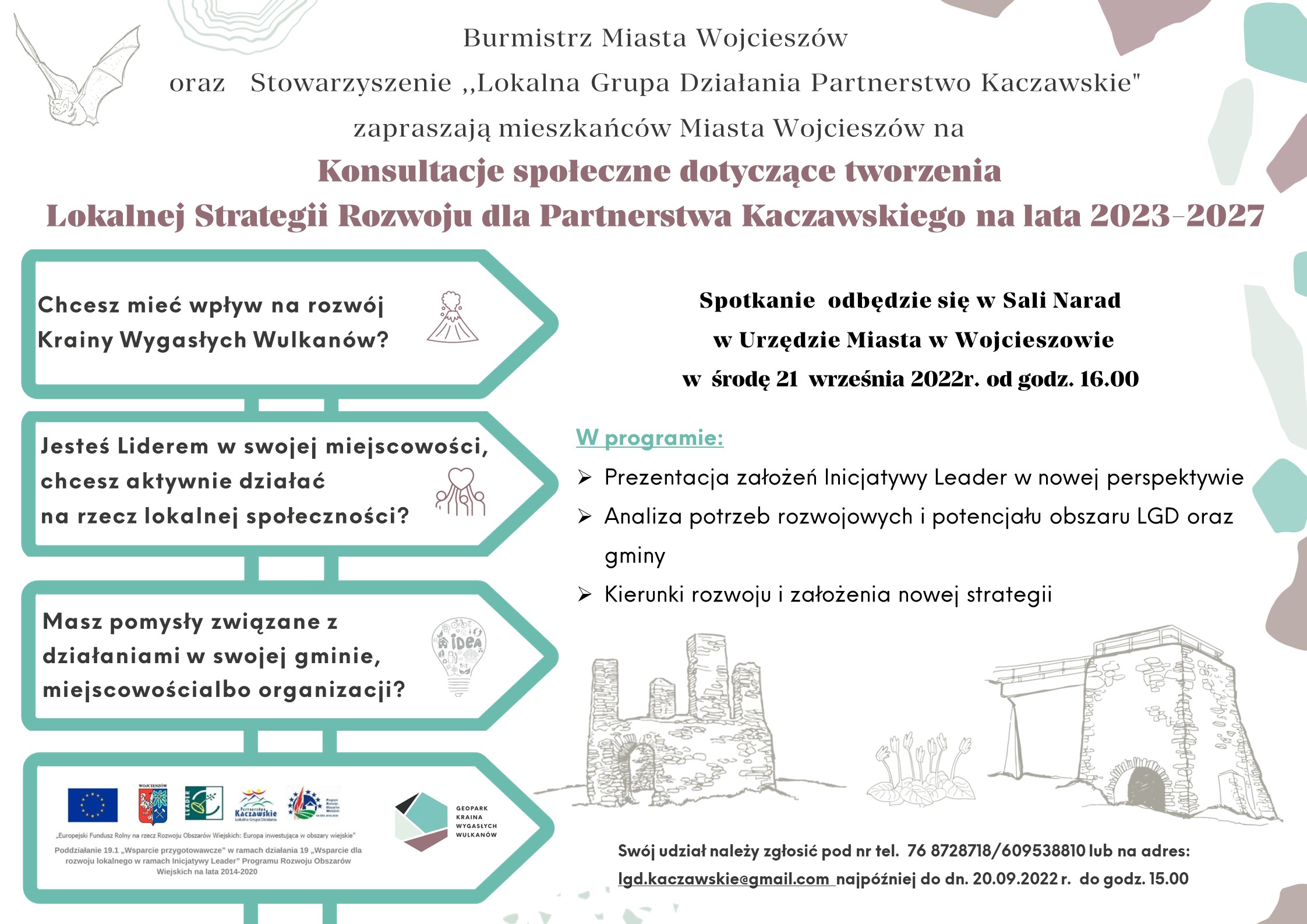 Udział należy zgłosić pod nr tel. 76 8728718/609538810 lub na adres: lgd.kaczawskie@gmail.com najpóźniej do dn. 20.09.2022 r. do godz. 15.00