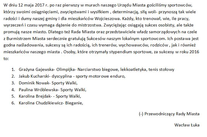 W dniu 12 maja 2017 po raz pierwszy w murach naszego Urzędu Miasta gościliśmy sportowców, którzy swoimi osiągnieciami , zwycięstwami i wysiłkiem, determinacją, siła woli – przynoszą tak wiele radości i dumy dla naszej gminy i dla i mieszkańców Wojcieszowa.