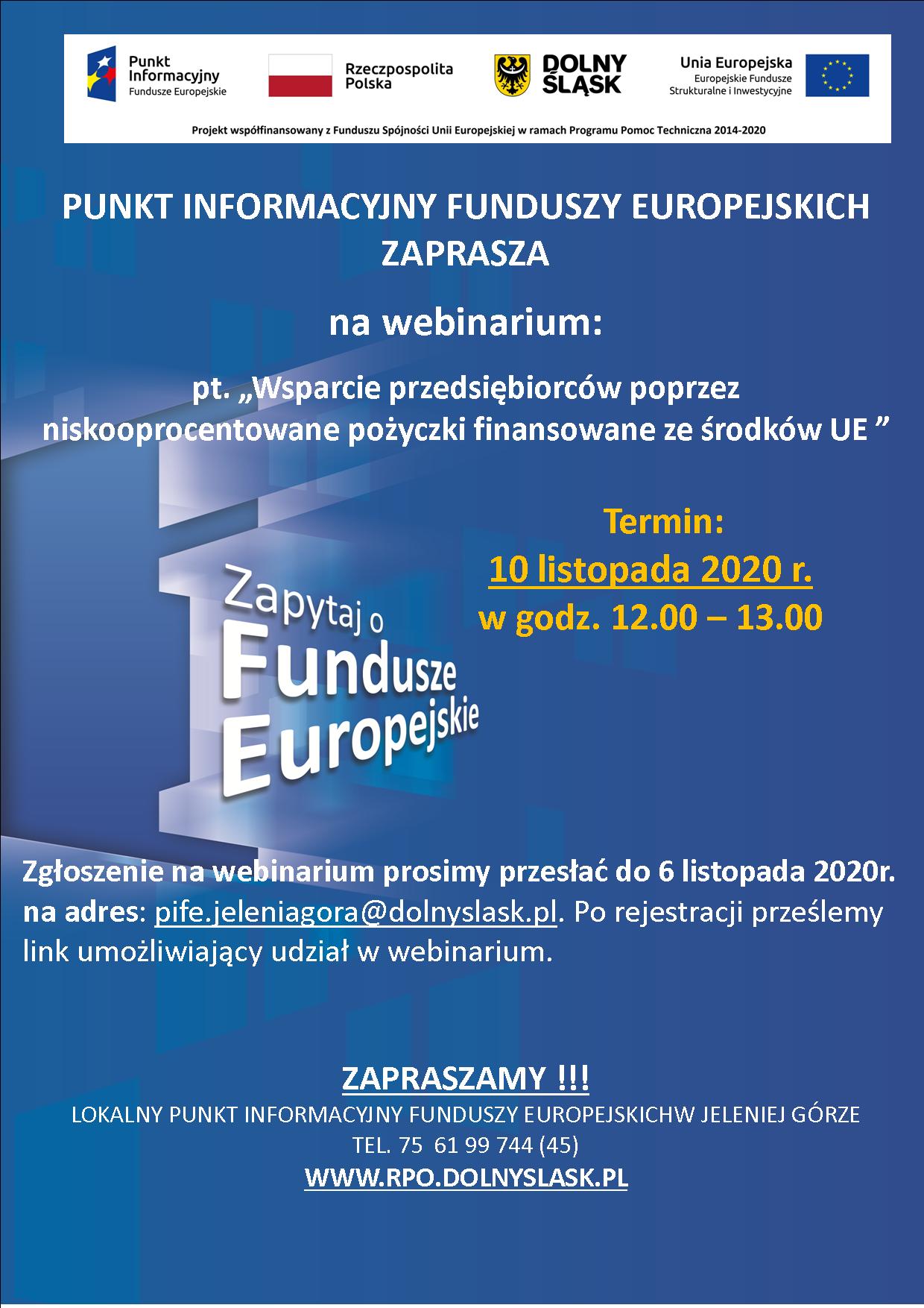 Punkt Informacyjny Funduszy Europejskich w Jeleniej Górze zaprasza  na webinarium pt. „Wsparcie przedsiębiorców poprzez niskooprocentowane pożyczki finansowane ze środków UE” – 10.11.2020 r.